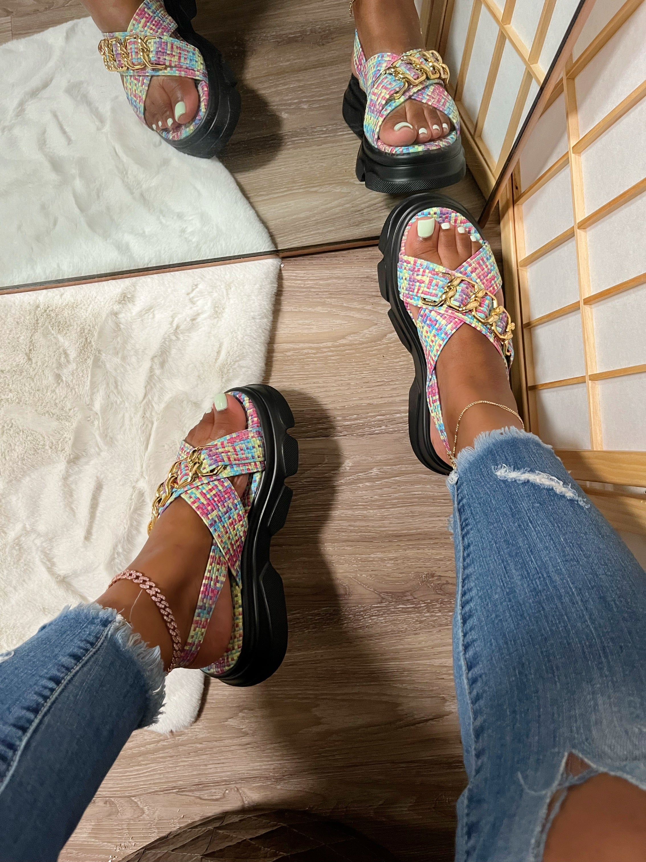 Chunky Sole, X Strap, Chain Detailing With Buckle Closure
